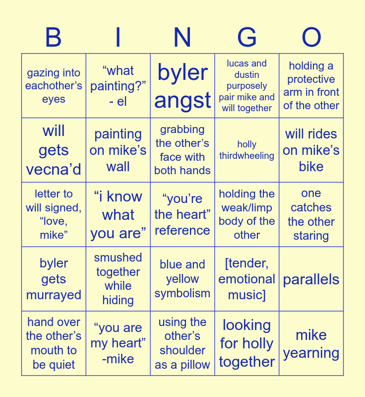 This bingo card has 25 words: smushed together while hiding, using the other’s shoulder as a pillow, grabbing the other’s face with both hands, hand over the other’s mouth to be quiet, holding a protective arm in front of the other, gazing into eachother’s eyes, will gets vecna’d, “what painting?” - el, holding the weak/limp body of the other, blue and yellow symbolism, holly thirdwheeling, letter to will signed, “love, mike”, [tender, emotional music], parallels, painting on mike’s wall, mike yearning, one catches the other staring, byler angst, will rides on mike’s bike, “i know what you are”, “you’re the heart” reference, “you are my heart” -mike, byler gets murrayed, lucas and dustin purposely pair mike and will together and looking for holly together.