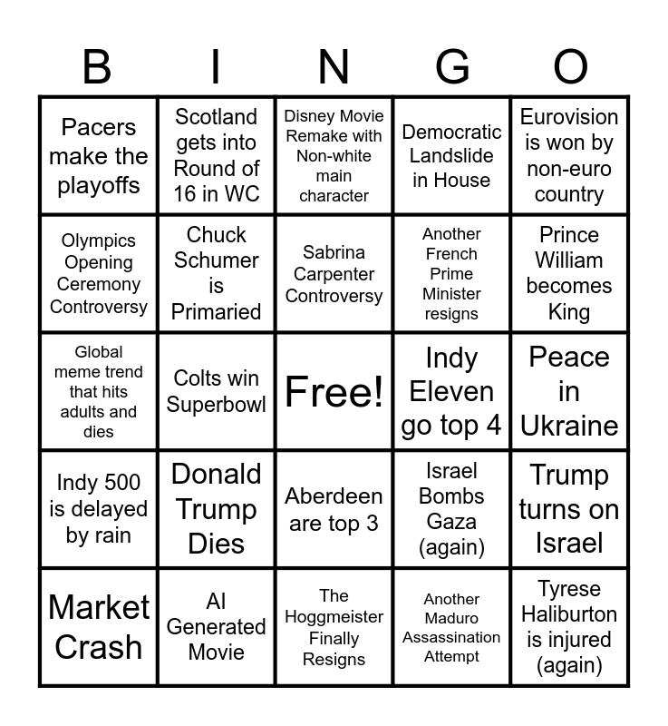 This bingo card has a free space and 24 words: Donald Trump Dies, AI Generated Movie, Sabrina Carpenter Controversy, Market Crash, Eurovision is won by non-euro country, Pacers make the playoffs, Olympics Opening Ceremony Controversy, Scotland gets into Round of 16 in WC, Indy Eleven go top 4, Aberdeen are top 3, Another French Prime Minister resigns, Global meme trend that hits adults and dies, Israel Bombs Gaza (again), Trump turns on Israel, Chuck Schumer is Primaried, Another Maduro Assassination Attempt, Peace in Ukraine, Disney Movie Remake with Non-white main character, Prince William becomes King, Colts win Superbowl, Tyrese Haliburton is injured (again), Indy 500 is delayed by rain, Democratic Landslide in House and The Hoggmeister Finally Resigns.