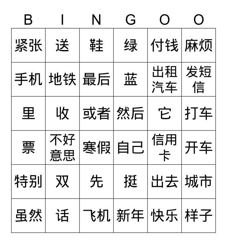 This bingo card has 36 words: 挺, 先, 新年, 手机, 票, 然后, 地铁, 飞机, 付钱, 出去, 发短信, 绿, 城市, 收, 蓝, 紧张, 特别, 它, 里, 鞋, 或者, 不好意思, 自己, 寒假, 信用卡, 送, 出租汽车, 话, 最后, 麻烦, 样子, 虽然, 开车, 打车, 双 and 快乐.