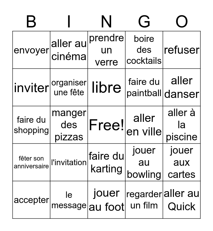 This bingo card has a free space and 24 words: l'invitation, le message, libre, accepter, refuser, envoyer, inviter, aller au cinéma, aller en ville, faire du karting, faire du paintball, faire du shopping, jouer au bowling, jouer aux cartes, organiser une fête, regarder un film, aller à la piscine, prendre un verre, aller danser, manger des pizzas, aller au Quick, fêter son anniversaire, boire des cocktails and jouer au foot.