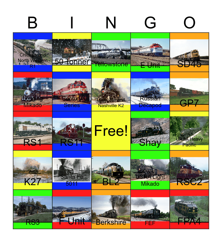 This bingo card has 24 images, a free space and 24 words: Santa Fe 5011, F Unit, Louisville and Nashville K2, RS3, SD45, Chicago and North Western R1, Logging Mikado, 50 Tonner, Shay, BL2, Russian Decapod, RS1, USRA Light Mikado, RSC2, Century Series, Union Pacific FEF, URSA Heavy Pacific, Yellowstone, GP7, RS11, FPA4, K27, E Unit and Berkshire.