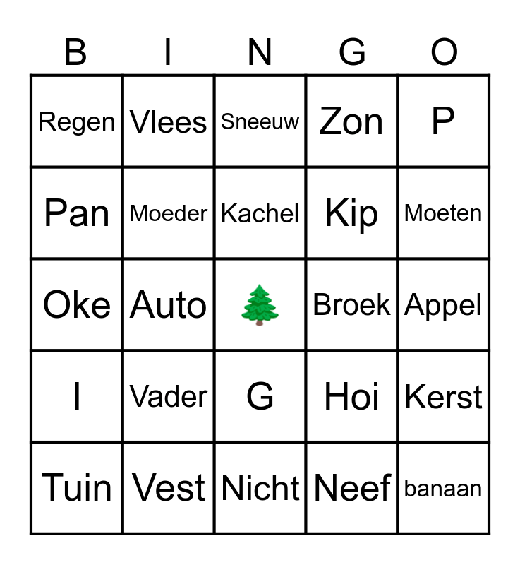 This bingo card has a free space and 29 words: Tuin, jas, Auto, Winter, Regen, Sneeuw, Moeder, Vader, Broek, Vest, Appel, banaan, Nicht, Neef, Moeten, Dwang, G, I, P, Oke, Hoi, Stro, Kip, Pan, Zon, Vlees, Kerst, Kachel and hout.