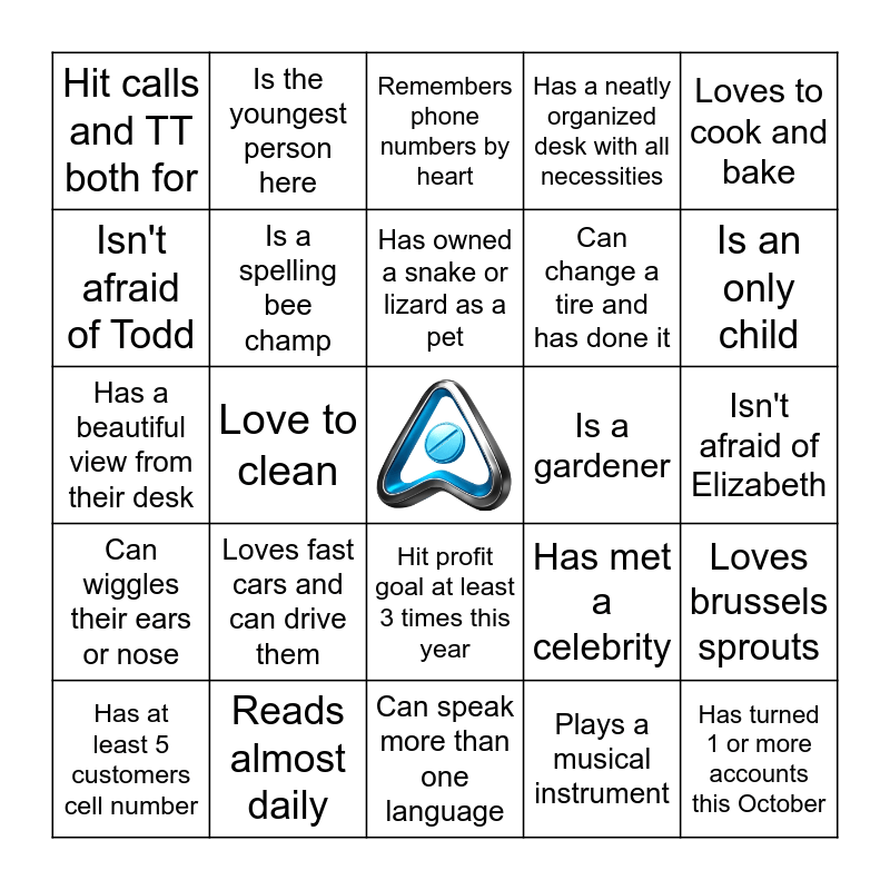 This bingo card has a free space and 24 words: Loves fast cars and can drive them, Reads almost daily, Has owned a snake or lizard as a pet, Has at least 5 customers cell number, Loves to cook and bake, Hit calls and TT both for, Isn't afraid of Todd, Is the youngest person here, Is a gardener, Hit profit goal at least 3 times this year, Can change a tire and has done it, Has a beautiful view from their desk, Has met a celebrity, Loves brussels sprouts, Is a spelling bee champ, Plays a musical instrument, Isn't afraid of Elizabeth, Remembers phone numbers by heart, Is an only child, Love to clean, Has turned 1 or more accounts this October, Can wiggles their ears or nose, Has a neatly organized desk with all necessities and Can speak more than one language.