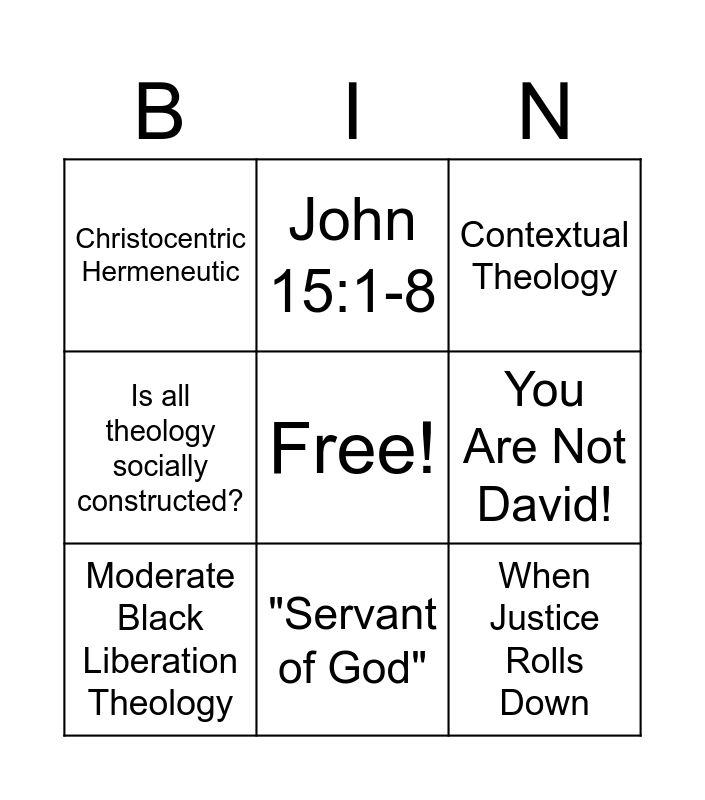 This bingo card has a free space and 8 words: You Are Not David!, Contextual Theology, John 15:1-8, Moderate Black Liberation Theology, Christocentric Hermeneutic, When Justice Rolls Down, Is all theology socially constructed? and "Servant of God".