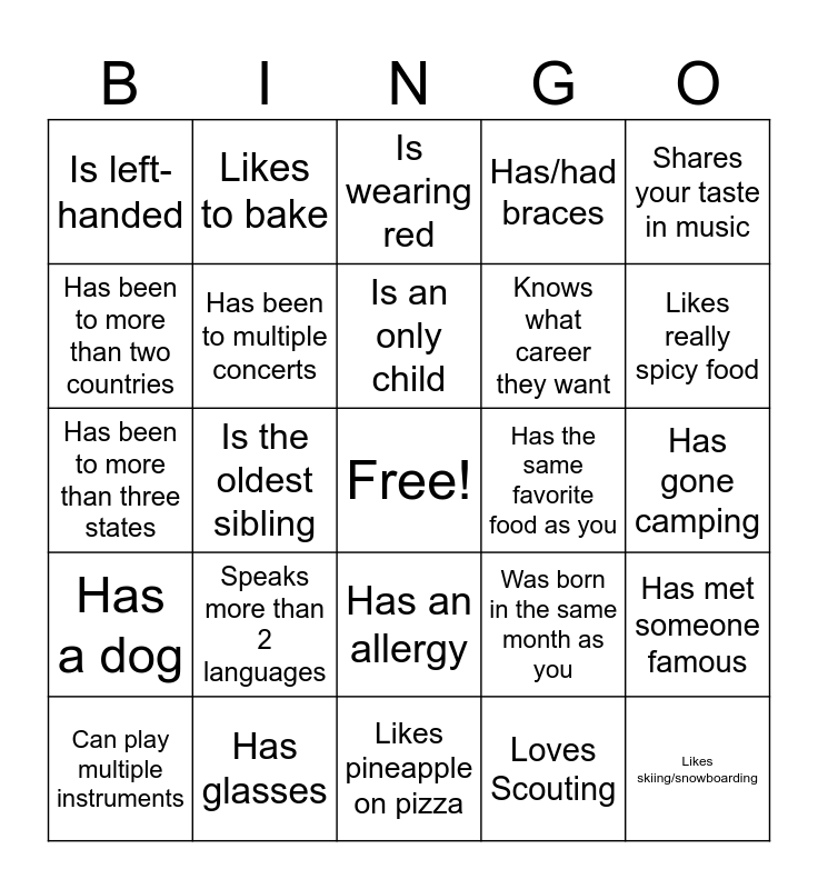 This bingo card has a free space and 25 words: Speaks more than 2 languages, Likes pineapple on pizza, Is an only child, Can play multiple instruments, Shares your taste in music, Is left-handed, Has been to more than two countries, Likes to bake, Has the same favorite food as you, Has an allergy, Knows what career they want, Has been to more than three states, Was born in the same month as you, Has met someone famous, Has been to multiple concerts, Has been on a cruise, Has gone camping, Is wearing red, Likes really spicy food, Is the oldest sibling, Likes skiing/snowboarding, Has glasses, Has a dog, Has/had braces and Loves Scouting.