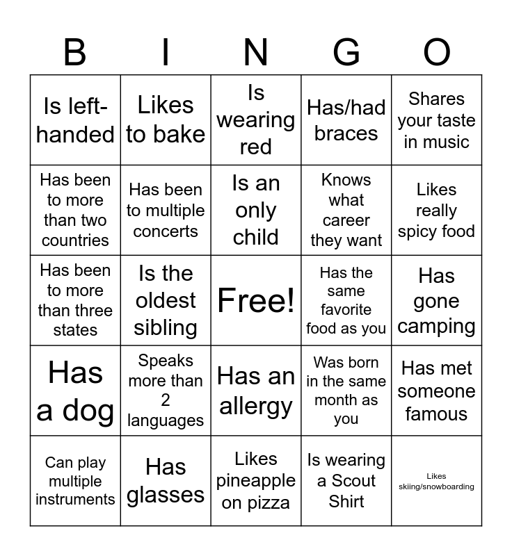 This bingo card has a free space and 25 words: Speaks more than 2 languages, Likes pineapple on pizza, Is an only child, Can play multiple instruments, Shares your taste in music, Is left-handed, Has been to more than two countries, Likes to bake, Has the same favorite food as you, Has an allergy, Knows what career they want, Has been to more than three states, Was born in the same month as you, Has met someone famous, Has been to multiple concerts, Has been on a cruise, Has gone camping, Is wearing red, Likes really spicy food, Is the oldest sibling, Likes skiing/snowboarding, Has glasses, Has a dog, Has/had braces and Is wearing a Scout Shirt.
