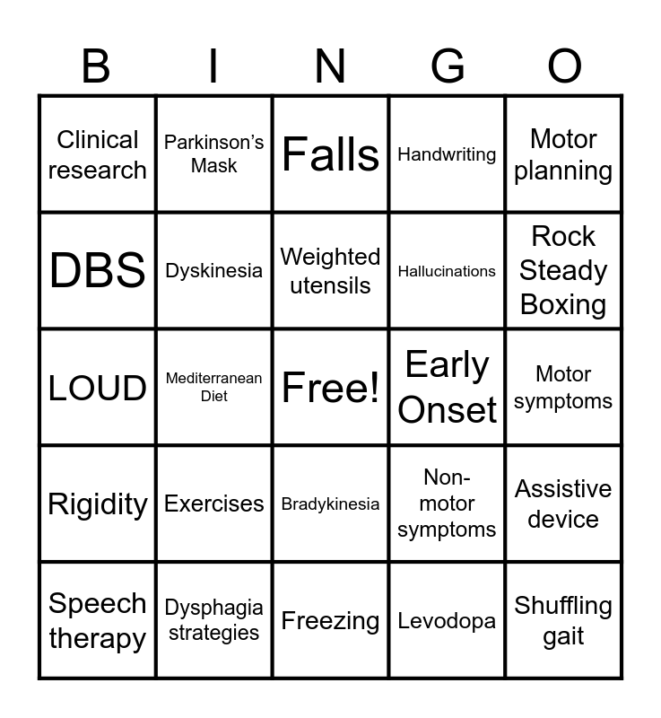 This bingo card has a free space and 29 words: Speech therapy, Infusion pumps, Mediterranean Diet, "Protein effect", Clinical research, Falls, Dyskinesia, Exercises, Early Onset, Dysphagia strategies, Motor symptoms, Shuffling gait, Freezing, Levodopa, Rock Steady Boxing, Posture, Bradykinesia, Rigidity, Motor planning, LOUD, Non-motor symptoms, Tremor, Hallucinations, DBS, Handwriting, Parkinson’s Mask, Assistive device, Weighted utensils and Yoga.