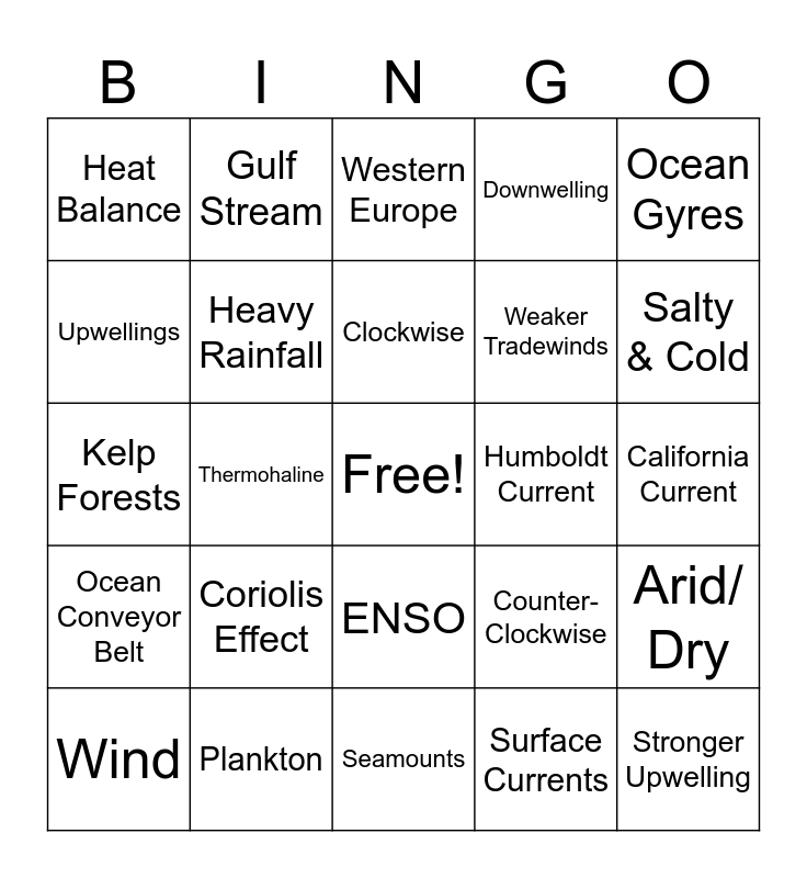 This bingo card has a free space and 24 words: Wind, Coriolis Effect, Clockwise, Surface Currents, Ocean Gyres, Heat Balance, Gulf Stream, Western Europe, Humboldt Current, California Current, Kelp Forests, Heavy Rainfall, Counter- Clockwise, Arid/ Dry, Upwellings, Plankton, Seamounts, Downwelling, Salty & Cold, Ocean Conveyor Belt, Thermohaline, ENSO, Weaker Tradewinds and Stronger Upwelling.