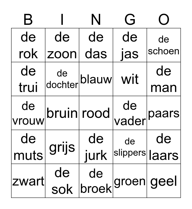 This bingo card has a free space and 24 words: grijs, de sok, blauw, zwart, de schoen, de rok, de trui, de zoon, de vader, de jurk, wit, de vrouw, de slippers, de laars, de dochter, groen, paars, de das, de man, bruin, geel, de muts, de jas and de broek.