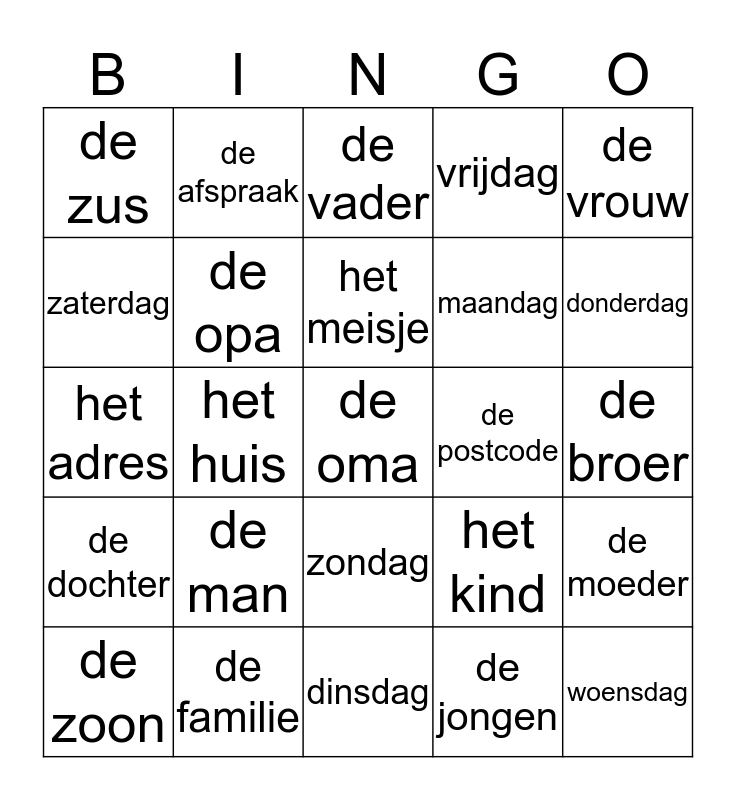 This bingo card has a free space and 24 words: de man, de familie, het meisje, de zoon, de vrouw, de zus, zaterdag, de afspraak, de postcode, zondag, maandag, het adres, het kind, de moeder, de opa, de jongen, de broer, de vader, donderdag, het huis, woensdag, de dochter, vrijdag and dinsdag.