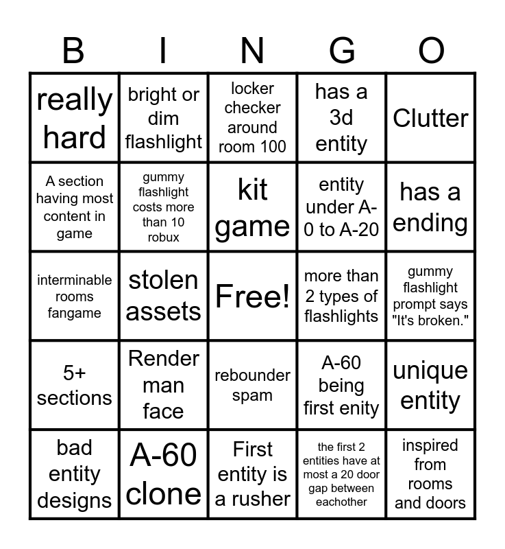 This bingo card has a free space and 24 words: Render man face, A-60 clone, kit game, bad entity designs, Clutter, really hard, A section having most content in game, bright or dim flashlight, more than 2 types of flashlights, rebounder spam, entity under A-0 to A-20, interminable rooms fangame, A-60 being first enity, unique entity, gummy flashlight costs more than 10 robux, the first 2 entities have at most a 20 door gap between eachother, gummy flashlight prompt says "It's broken.", locker checker around room 100, has a ending, stolen assets, inspired from rooms and doors, 5+ sections, has a 3d entity and First entity is a rusher.