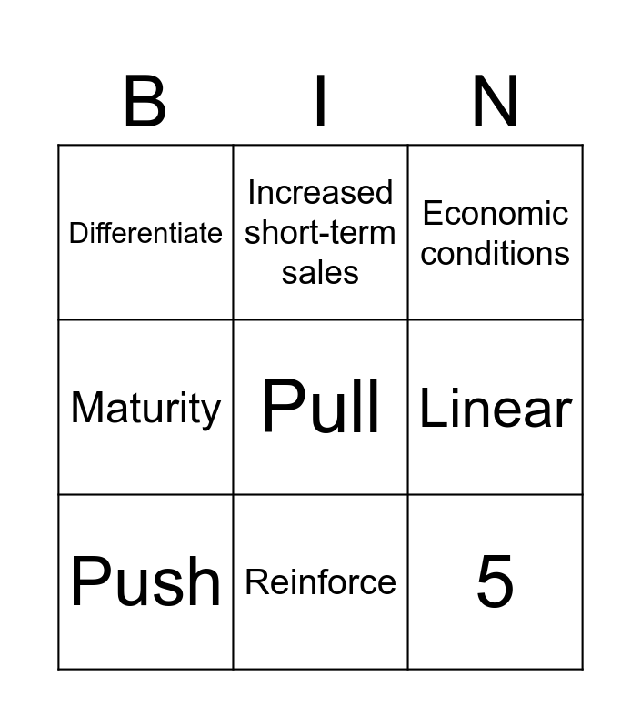 This bingo card has a free space and 8 words: Linear, Economic conditions, Increased short-term sales, Push, Differentiate, 5, Maturity and Reinforce.
