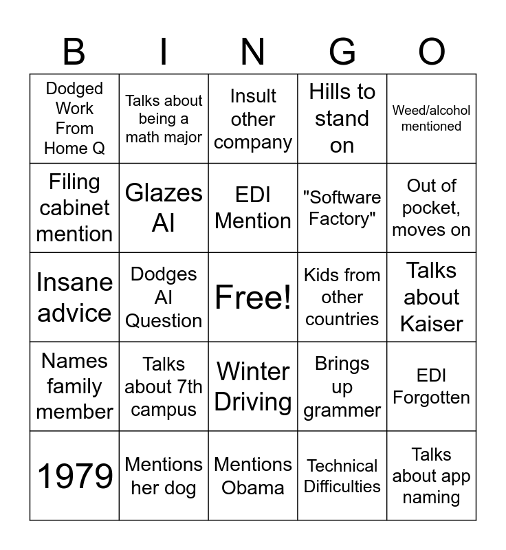 This bingo card has a free space and 29 words: 1979, Commandments, Dodges AI Question, Roasts Asker, Dodged Work From Home Q, Insult other company, Glazes AI, Talks about 7th campus, Kids from other countries, Mentions her dog, Talks about Kaiser, Talks about app naming, Mentions Obama, Technical Difficulties, Out of pocket, moves on, Name drops CEO, Winter Driving, Names family member, Weed/alcohol mentioned, Insane advice, Brings up grammer, Implication of Epic Monopoly, "Software Factory", Filing cabinet mention, Hills to stand on, Talks about being a math major, EDI Forgotten, EDI Mention and Takes a live poll.
