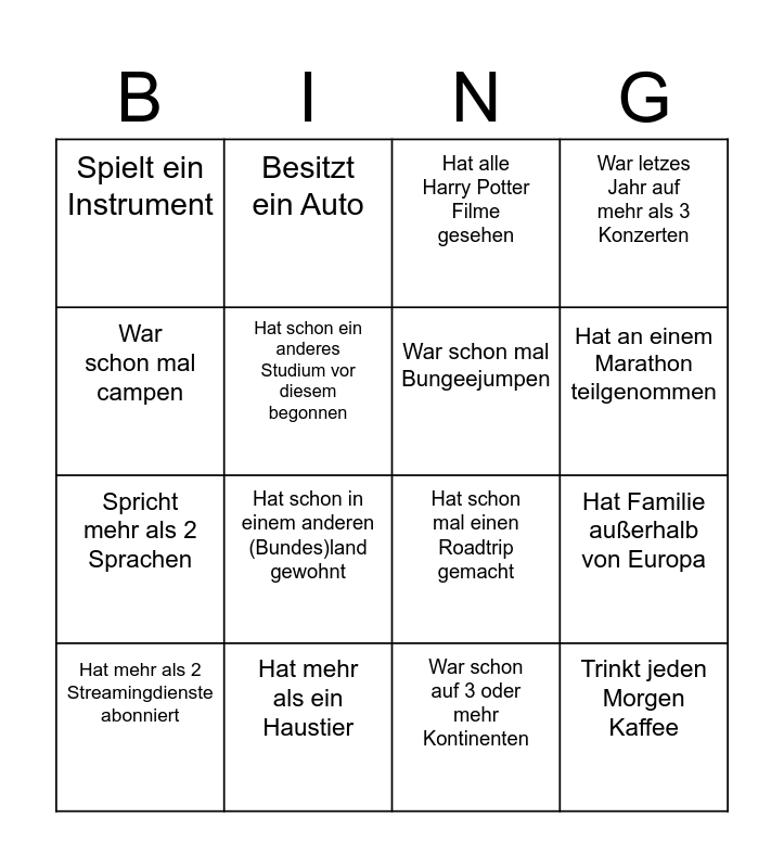 This bingo card has 16 words: Hat mehr als ein Haustier, Hat Familie außerhalb von Europa, Hat alle Harry Potter Filme gesehen, Spielt ein Instrument, Spricht mehr als 2 Sprachen, Besitzt ein Auto, Hat schon mal einen Roadtrip gemacht, War schon auf 3 oder mehr Kontinenten, War schon mal campen, Hat schon ein anderes Studium vor diesem begonnen, Hat mehr als 2 Streamingdienste abonniert, War letzes Jahr auf mehr als 3 Konzerten, Hat schon in einem anderen (Bundes)land gewohnt, Hat an einem Marathon teilgenommen, War schon mal Bungeejumpen and Trinkt jeden Morgen Kaffee.