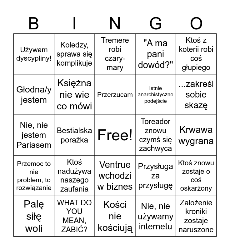 This bingo card has a free space and 24 words: Ktoś nadużywa naszego zaufania, WHAT DO YOU MEAN, ZABIĆ?, Przerzucam, Palę siłę woli, Ktoś z koterii robi coś głupiego, Używam dyscypliny!, Głodna/y jestem, Koledzy, sprawa się komplikuje, Toreador znowu czymś się zachwyca, Ventrue wchodzi w biznes, Istnie anarchistyczne podejście, Nie, nie jestem Pariasem, Przysługa za przysługę, Ktoś znowu zostaje o coś oskarżony, Księżna nie wie co mówi, Nie, nie używamy internetu, Krwawa wygrana, Tremere robi czary-mary, ...zakreśl sobie skazę, Bestialska porażka, Założenie kroniki zostaje naruszone, Przemoc to nie problem, to rozwiązanie, "A ma pani dowód?" and Kości nie kościują.