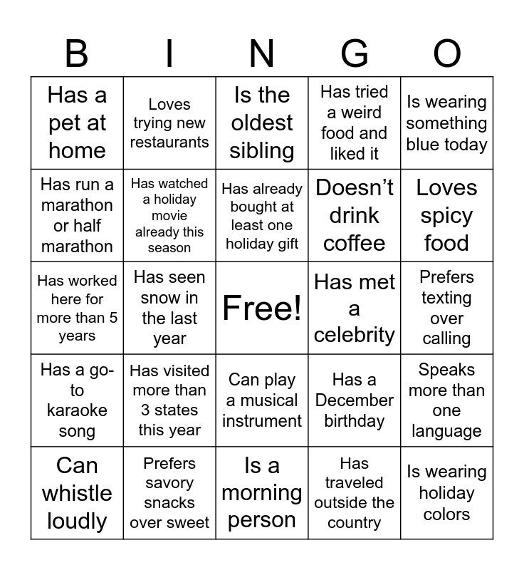 This bingo card has a free space and 24 words: Has visited more than 3 states this year, Prefers savory snacks over sweet, Has already bought at least one holiday gift, Can whistle loudly, Is wearing something blue today, Has a pet at home, Has run a marathon or half marathon, Loves trying new restaurants, Has met a celebrity, Can play a musical instrument, Doesn’t drink coffee, Has worked here for more than 5 years, Has a December birthday, Speaks more than one language, Has watched a holiday movie already this season, Has traveled outside the country, Prefers texting over calling, Is the oldest sibling, Loves spicy food, Has seen snow in the last year, Is wearing holiday colors, Has a go-to karaoke song, Has tried a weird food and liked it and Is a morning person.