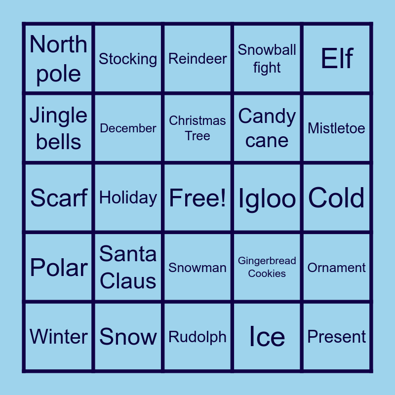 This bingo card has a free space and 24 words: Santa Claus, Snow, Christmas Tree, Winter, Elf, North pole, Jingle bells, Stocking, Igloo, Snowman, Candy cane, Scarf, Gingerbread Cookies, Ornament, December, Ice, Cold, Reindeer, Mistletoe, Holiday, Present, Polar, Snowball fight and Rudolph.