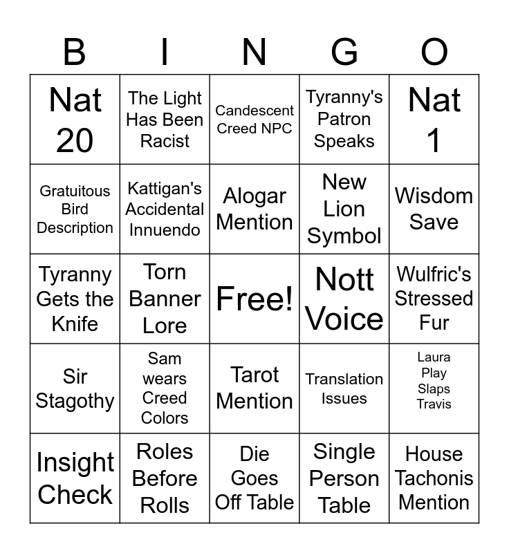 This bingo card has a free space and 24 words: Sam wears Creed Colors, Roles Before Rolls, Alogar Mention, Insight Check, Nat 1, Nat 20, Gratuitous Bird Description, The Light Has Been Racist, Nott Voice, Tarot Mention, New Lion Symbol, Tyranny Gets the Knife, Translation Issues, Laura Play Slaps Travis, Kattigan's Accidental Innuendo, Single Person Table, Wulfric's Stressed Fur, Candescent Creed NPC, Wisdom Save, Torn Banner Lore, House Tachonis Mention, Sir Stagothy, Tyranny's Patron Speaks and Die Goes Off Table.