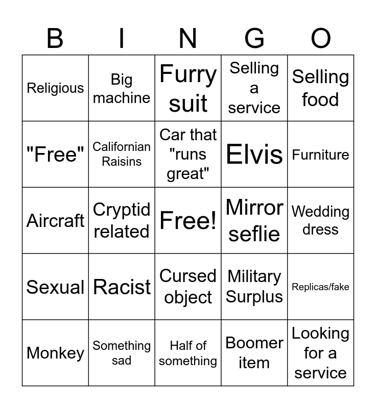 This bingo card has a free space and 24 words: Racist, Something sad, Car that "runs great", Monkey, Selling food, Religious, "Free", Big machine, Mirror seflie, Cursed object, Elvis, Aircraft, Military Surplus, Replicas/fake, Californian Raisins, Boomer item, Wedding dress, Furry suit, Furniture, Cryptid related, Looking for a service, Sexual, Selling a service and Half of something.