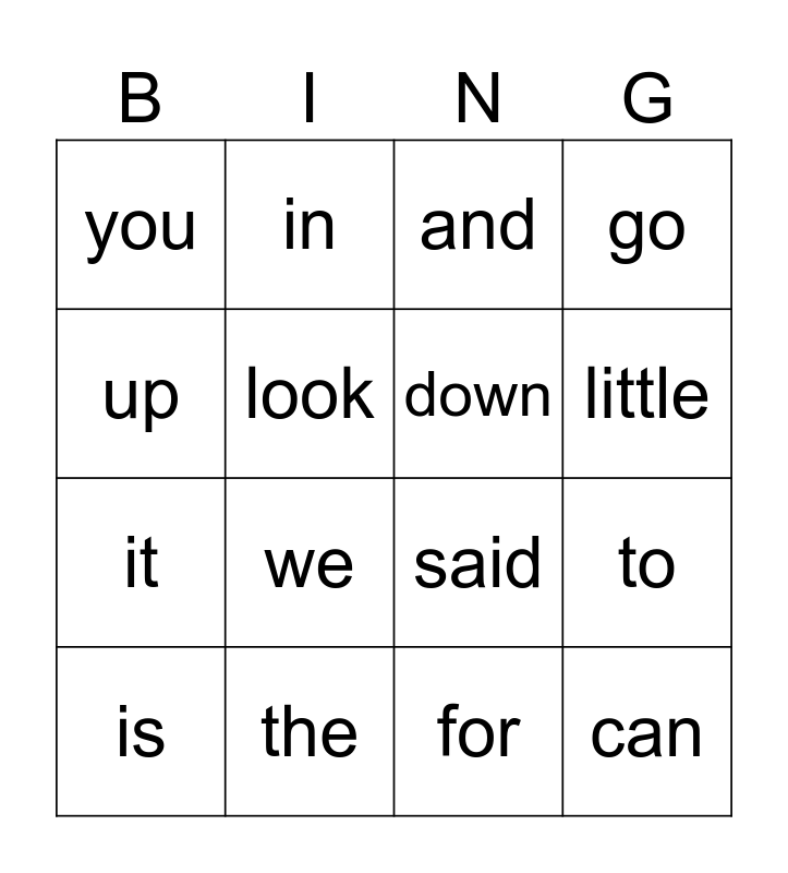 This bingo card has 16 words: the, to, and, you, it, in, said, for, up, look, is, go, we, little, down and can.