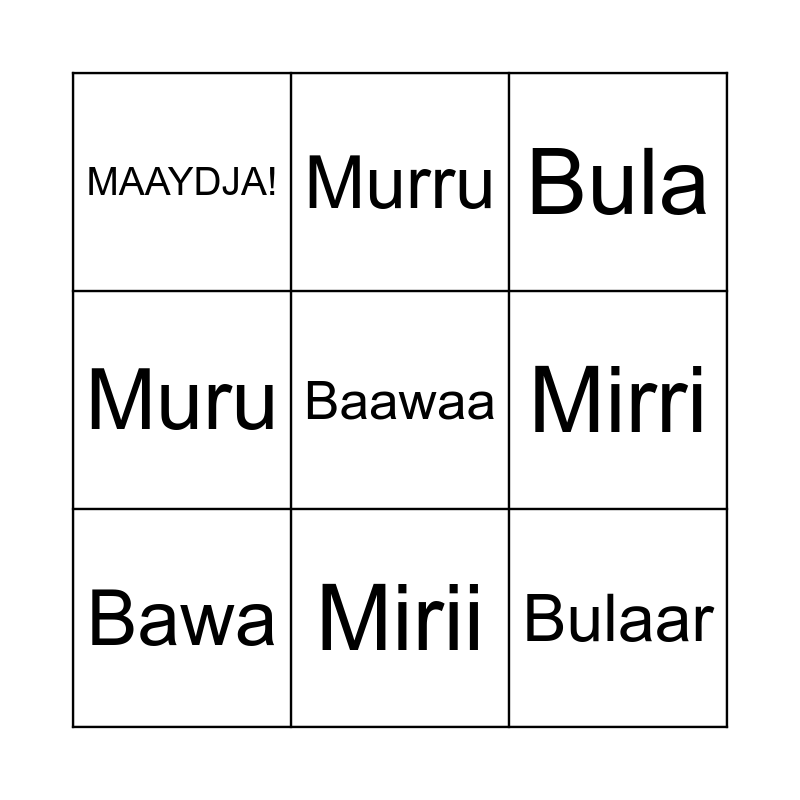 This bingo card has 9 words: Bawa, Bula, Murru, Muru, MAAYDJA!, Mirri, Baawaa, Bulaar and Mirii.