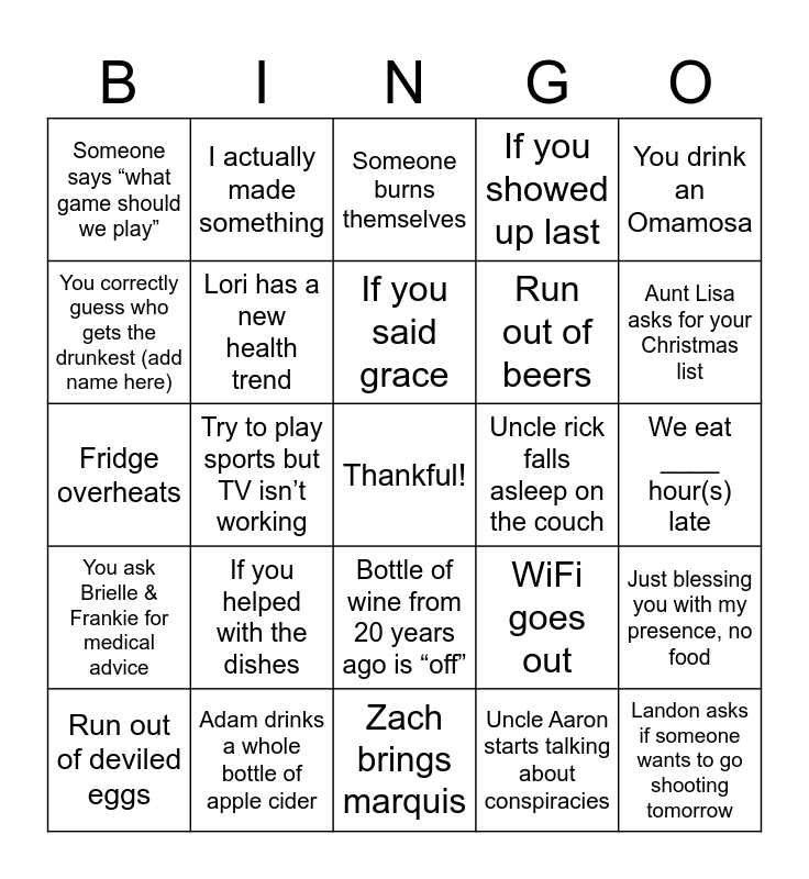 This bingo card has a free space and 29 words: Run out of deviled eggs, Diana asks for hot sauce, Try to play sports but TV isn’t working, Dog pees in the house, Someone says “what game should we play”, Someone burns themselves, Lori has a new health trend, If you helped with the dishes, Uncle rick falls asleep on the couch, Adam drinks a whole bottle of apple cider, We eat ____ hour(s) late, Landon asks if someone wants to go shooting tomorrow, Zach brings marquis, Uncle Aaron starts talking about conspiracies, Aunt Lisa asks for your Christmas list, Oma doesn’t fall, Bottle of wine from 20 years ago is “off”, You ask Brielle & Frankie for medical advice, You drink an Omamosa, Fridge overheats, WiFi goes out, An ex wishes you a happy Thanksgiving, Run out of beers, You correctly guess who gets the drunkest (add name here), If you showed up last, I actually made something, Just blessing you with my presence, no food, If you said grace and If you woke up hungover from blackout Wednesday.
