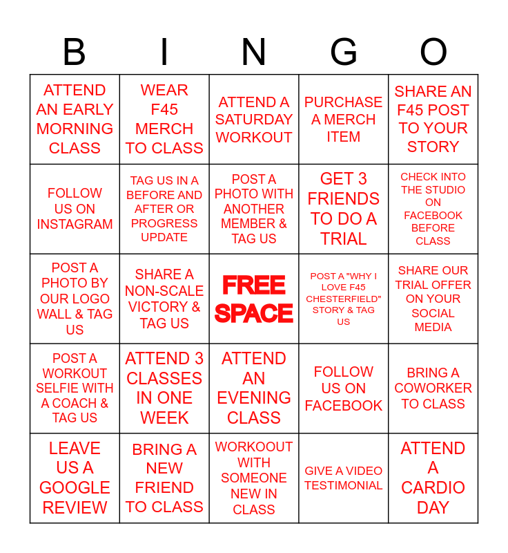 This bingo card has a free space and 24 words: ATTEND 3 CLASSES IN ONE WEEK, BRING A NEW FRIEND TO CLASS, POST A PHOTO WITH ANOTHER MEMBER & TAG US, LEAVE US A GOOGLE REVIEW, SHARE AN F45 POST TO YOUR STORY, ATTEND AN EARLY MORNING CLASS, FOLLOW US ON INSTAGRAM, WEAR F45 MERCH TO CLASS, POST A "WHY I LOVE F45 CHESTERFIELD" STORY & TAG US, ATTEND AN EVENING CLASS, GET 3 FRIENDS TO DO A TRIAL, POST A PHOTO BY OUR LOGO WALL & TAG US, FOLLOW US ON FACEBOOK, BRING A COWORKER TO CLASS, TAG US IN A BEFORE AND AFTER OR PROGRESS UPDATE, GIVE A VIDEO TESTIMONIAL, SHARE OUR TRIAL OFFER ON YOUR SOCIAL MEDIA, ATTEND A SATURDAY WORKOUT, CHECK INTO THE STUDIO ON FACEBOOK BEFORE CLASS, SHARE A NON-SCALE VICTORY & TAG US, ATTEND A CARDIO DAY, POST A WORKOUT SELFIE WITH A COACH & TAG US, PURCHASE A MERCH ITEM and WORKOOUT WITH SOMEONE NEW IN CLASS.