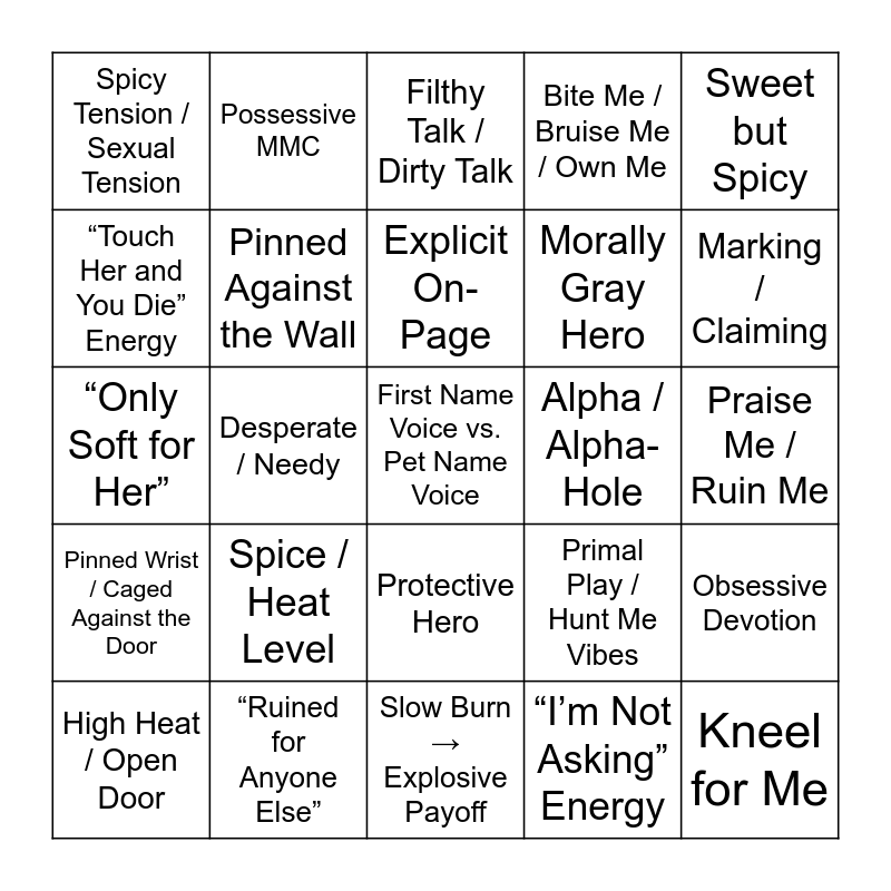 This bingo card has 25 words: Spice / Heat Level, Slow Burn → Explosive Payoff, Explicit On-Page, High Heat / Open Door, Sweet but Spicy, Spicy Tension / Sexual Tension, “Touch Her and You Die” Energy, Possessive MMC, Alpha / Alpha-Hole, Protective Hero, Morally Gray Hero, “Only Soft for Her”, Primal Play / Hunt Me Vibes, Obsessive Devotion, Pinned Against the Wall, Kneel for Me, Praise Me / Ruin Me, Filthy Talk / Dirty Talk, Marking / Claiming, Desperate / Needy, First Name Voice vs. Pet Name Voice, “Ruined for Anyone Else”, Pinned Wrist / Caged Against the Door, Bite Me / Bruise Me / Own Me and “I’m Not Asking” Energy.