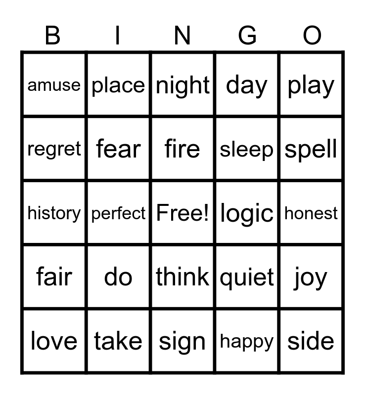 This bingo card has a free space and 24 words: do, take, fire, love, play, amuse, regret, place, logic, think, sleep, history, quiet, joy, fear, happy, honest, night, spell, perfect, side, fair, day and sign.