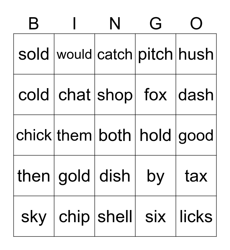 This bingo card has 40 words: chin, chick, chop, chat, chip, dish, shop, ship, hush, then, them, pitch, both, good, hold, gold, told, sold, lunch, catch, tax, six, fox, cold, mix, fix, one, two, licks, shock, stall, sky, fry, by, dash, shell, tank, should, would and thinks.
