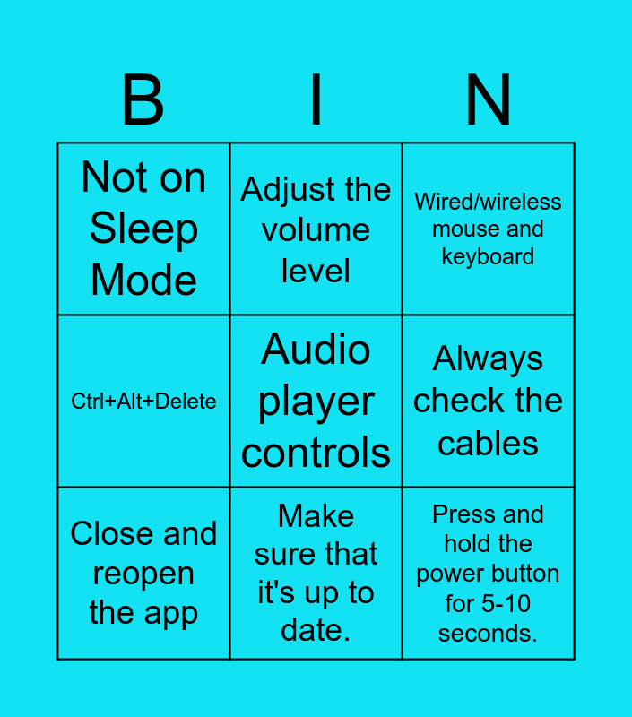This bingo card has 9 words: Close and reopen the app, Wired/wireless mouse and keyboard, Adjust the volume level, Ctrl+Alt+Delete, Not on Sleep Mode, Always check the cables, Audio player controls, Press and hold the power button for 5-10 seconds. and Make sure that it's up to date..