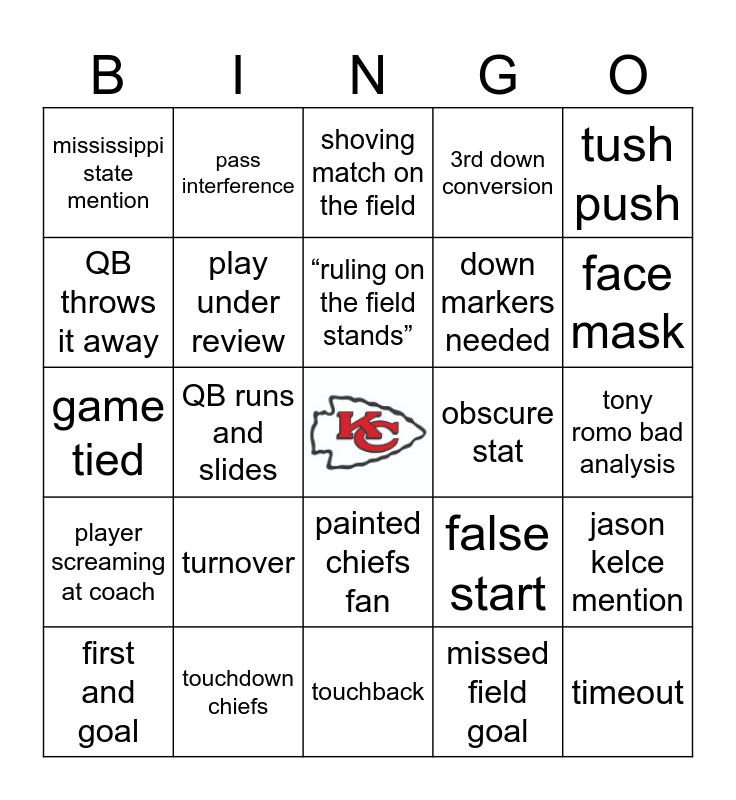 This bingo card has a free space and 29 words: first and goal, challenge flag, QB runs and slides, cheerleaders, mississippi state mention, shoving match on the field, play under review, turnover, obscure stat, touchdown chiefs, tony romo bad analysis, timeout, touchback, missed field goal, face mask, fumble, painted chiefs fan, player screaming at coach, tush push, game tied, false start, mahomes chewing his mouth guard, down markers needed, QB throws it away, 3rd down conversion, pass interference, jason kelce mention, “ruling on the field stands” and super bowl mention.
