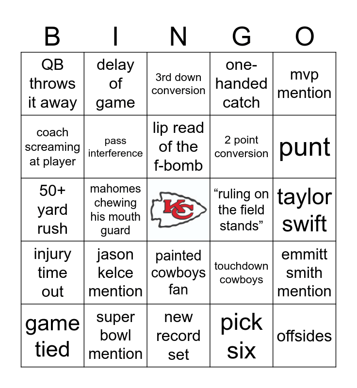 This bingo card has a free space and 29 words: game tied, false start, mahomes chewing his mouth guard, down markers needed, QB throws it away, 3rd down conversion, pass interference, jason kelce mention, “ruling on the field stands”, super bowl mention, taylor swift, offsides, new record set, pick six, punt, play drawn on the screen, painted cowboys fan, injury time out, mvp mention, 50+ yard rush, touchdown cowboys, texas tech mention, 2 point conversion, coach screaming at player, one-handed catch, delay of game, emmitt smith mention, lip read of the f-bomb and kelce throws a fit.