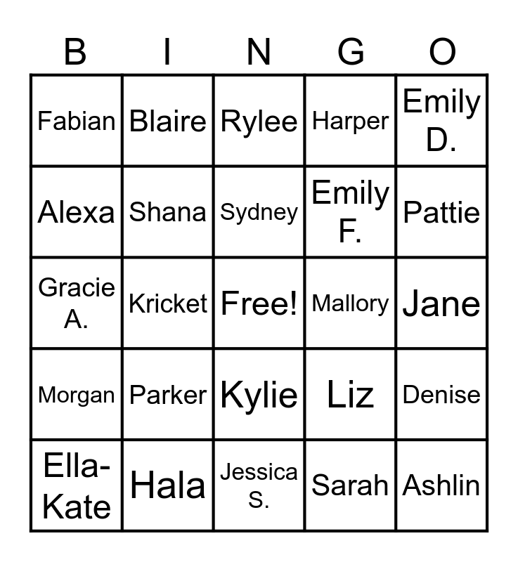 This bingo card has a free space and 45 words: Gracie, Ashlin, Sophie, Ella-Kate, Rachel, Sarah, Rylee, Elena, Emily D., Hala, Harper, Mallory, Kylie, Parker, Marleigh, Jessica S., Jessica M., Gracie A., Andrea, Pattie, Blaire, Sophia, Paige, Fabian, Wendy, Jane, Emily M., Emma, Liz, Morgan, Katie, Denise, Jennifer L., Makensi, Alyssa, Kricket, Faith, Kimberly, Mary-Ellen, Sydney, Alexa, Emily F., Addie, Shana and Jennifer J..