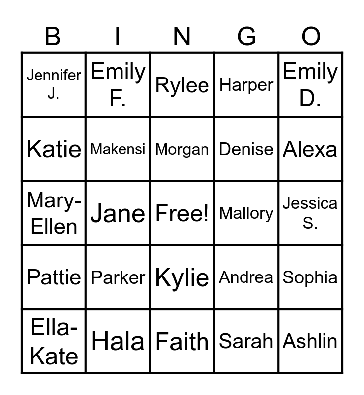This bingo card has a free space and 45 words: Gracie, Ashlin, Sophie, Ella-Kate, Rachel, Sarah, Rylee, Elena, Emily D., Hala, Harper, Mallory, Kylie, Parker, Kricket, Faith, Kimberly, Mary-Ellen, Sydney, Alexa, Emily F., Addie, Shana, Jennifer J., Marleigh, Jessica S., Jessica M., Gracie A., Andrea, Pattie, Blaire, Sophia, Paige, Fabian, Wendy, Jane, Emily M., Emma, Liz, Morgan, Katie, Denise, Jennifer L., Makensi and Alyssa.