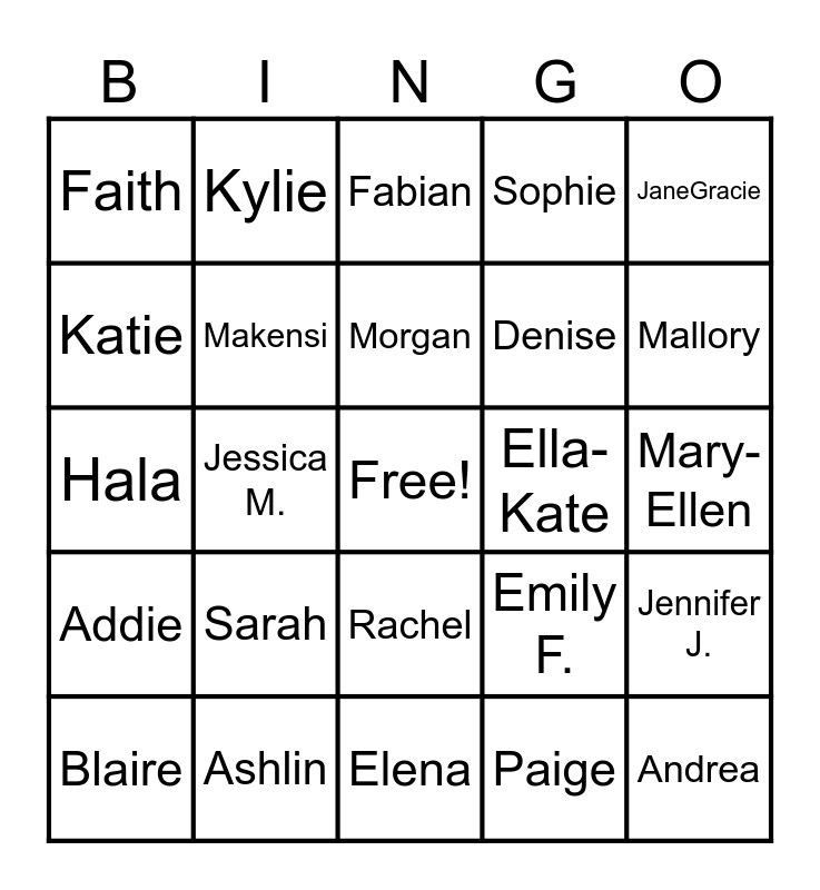 This bingo card has a free space and 44 words: Gracie A., Andrea, Pattie, Blaire, Sophia, Paige, Fabian, Wendy, JaneGracie, Ashlin, Sophie, Ella-Kate, Rachel, Sarah, Rylee, Elena, Emily D., Hala, Harper, Mallory, Kylie, Parker, Kricket, Faith, Kimberly, Mary-Ellen, Sydney, Alexa, Emily F., Addie, Shana, Jennifer J., Marleigh, Jessica S., Jessica M., Emily M., Emma, Liz, Morgan, Katie, Denise, Jennifer L., Makensi and Alyssa.