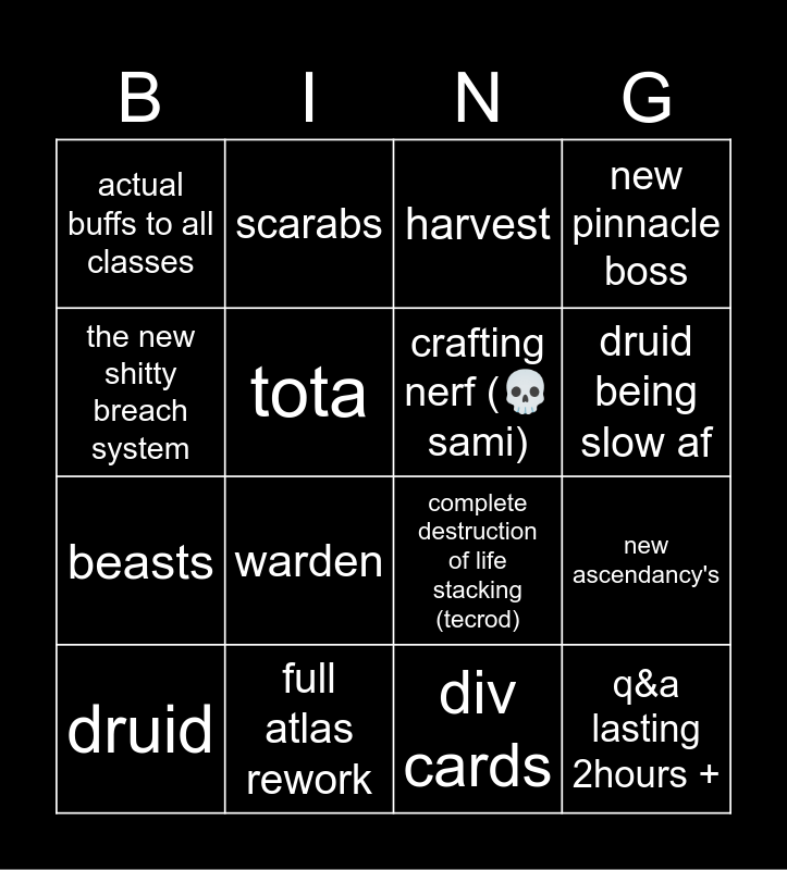 This bingo card has 16 words: druid, full atlas rework, harvest, new pinnacle boss, the new shitty breach system, scarabs, complete destruction of life stacking (tecrod), new ascendancy's, actual buffs to all classes, tota, div cards, druid being slow af, beasts, warden, crafting nerf (💀sami) and q&a lasting 2hours +.