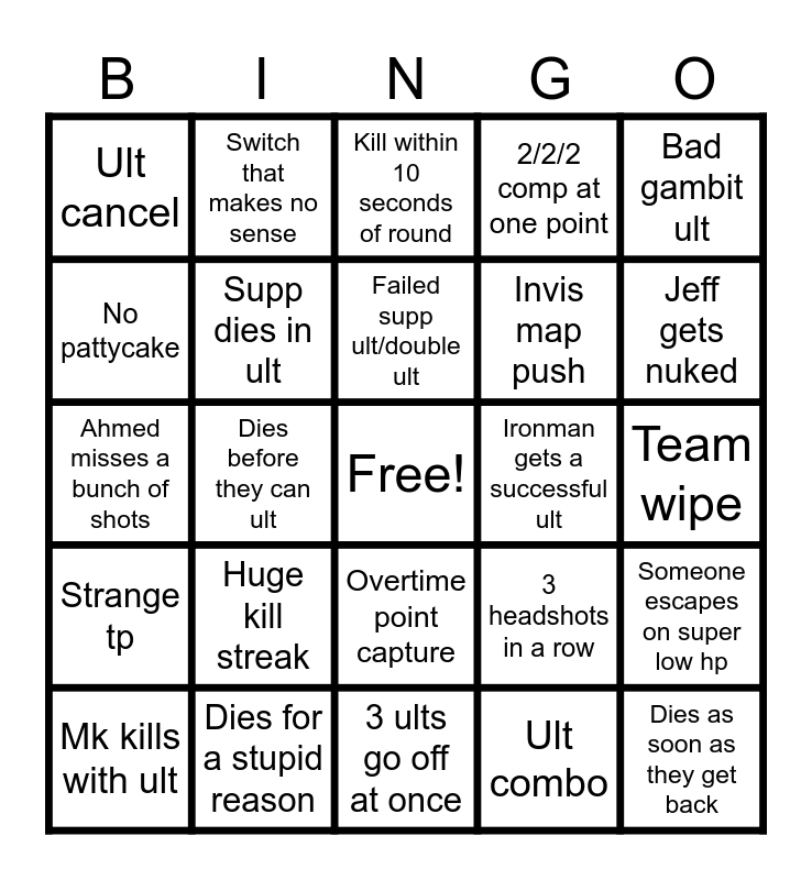 This bingo card has a free space and 24 words: Huge kill streak, Dies for a stupid reason, Failed supp ult/double ult, Mk kills with ult, Bad gambit ult, Ult cancel, No pattycake, Switch that makes no sense, Ironman gets a successful ult, Overtime point capture, Invis map push, Ahmed misses a bunch of shots, 3 headshots in a row, Someone escapes on super low hp, Supp dies in ult, Ult combo, Team wipe, Kill within 10 seconds of round, Jeff gets nuked, Dies before they can ult, Dies as soon as they get back, Strange tp, 2/2/2 comp at one point and 3 ults go off at once.