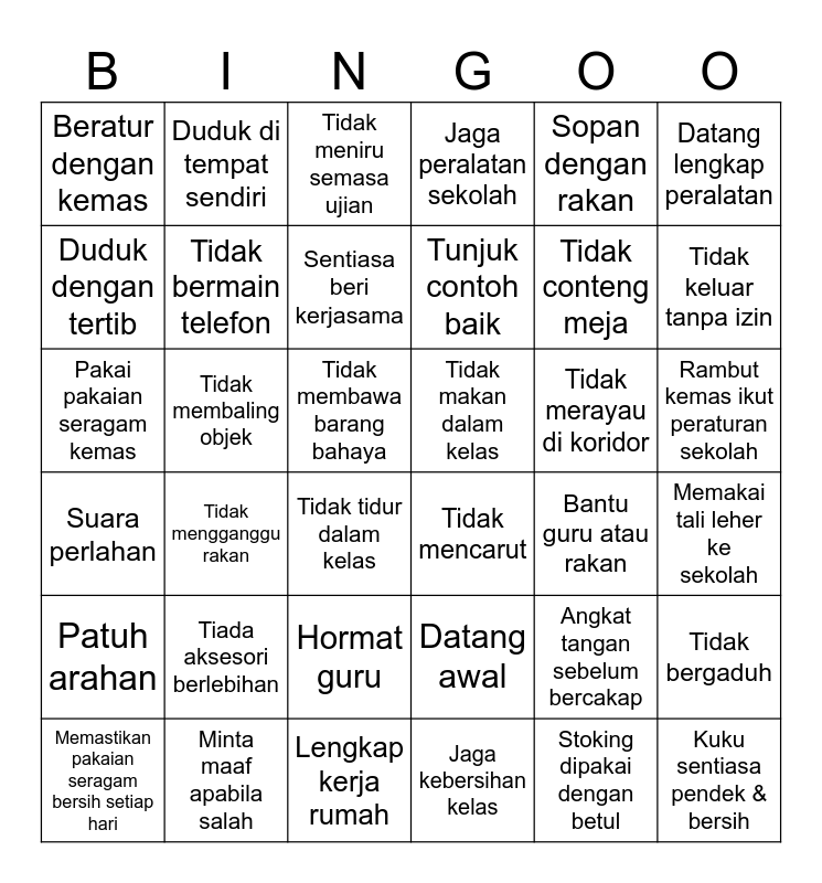 This bingo card has 36 words: Datang awal, Hormat guru, Jaga kebersihan kelas, Duduk dengan tertib, Suara perlahan, Tidak makan dalam kelas, Tidak bermain telefon, Lengkap kerja rumah, Sopan dengan rakan, Angkat tangan sebelum bercakap, Tidak keluar tanpa izin, Jaga peralatan sekolah, Tidak bergaduh, Tidak membaling objek, Tunjuk contoh baik, Beratur dengan kemas, Patuh arahan, Tidak merayau di koridor, Pakai pakaian seragam kemas, Tidak meniru semasa ujian, Tidak membawa barang bahaya, Tidak mengganggu rakan, Tidak mencarut, Tidak tidur dalam kelas, Bantu guru atau rakan, Duduk di tempat sendiri, Tidak conteng meja, Minta maaf apabila salah, Sentiasa beri kerjasama, Datang lengkap peralatan, Kuku sentiasa pendek & bersih, Memastikan pakaian seragam bersih setiap hari, Memakai tali leher ke sekolah, Rambut kemas ikut peraturan sekolah, Tiada aksesori berlebihan and Stoking dipakai dengan betul.