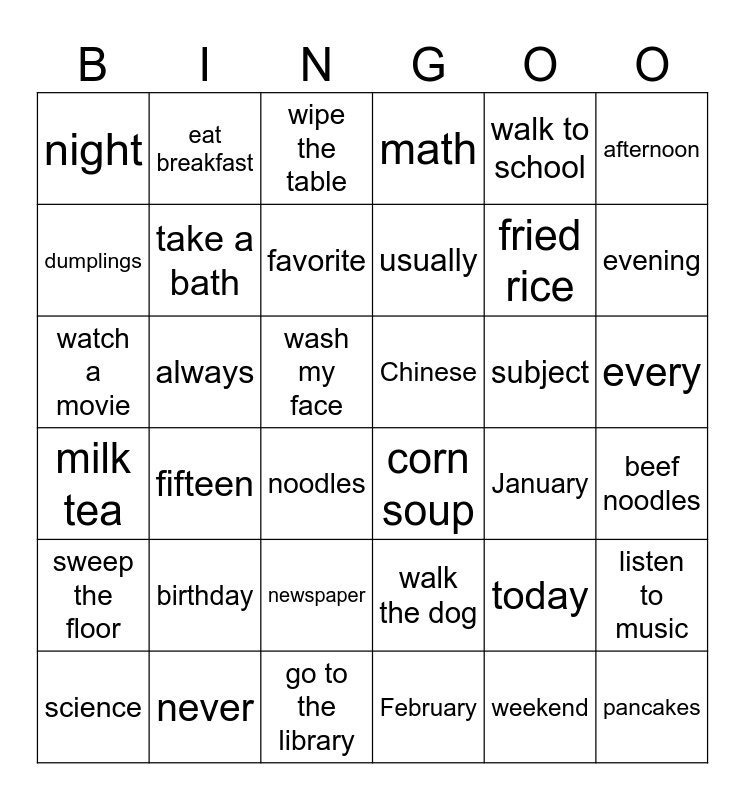 This bingo card has 66 words: date, today, first, fifteen, birthday, get up, eat breakfast, eat lunch, take a bath, eat dinner, every, brush my teeth, wash my face, walk to school, morning, afternoon, evening, night, comb my hair, favorite, subject, Chinese, math, science, English, weekend, go to the library, go to the gym, watch a movie, steak, noodles, bread, soup, soybean, milk tea, corn soup, fried chicken, fried rice, beef noodles, pancakes, dumplings, newspaper, always, seldom, sometimes, never, usually, hang the clothes, sweep the floor, walk the dog, exercise, busy, clean, early, dirty, listen to music, water the flower, ride a horse, wipe the table, January, February, march, April, May, July and August.