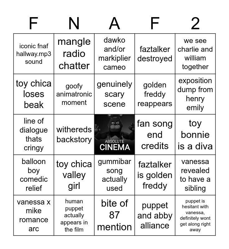 This bingo card has a free space and 24 words: toy chica valley girl, human puppet actually appears in the film, genuinely scary scene, vanessa x mike romance arc, we see charlie and william together, iconic fnaf hallway.mp3 sound, toy chica loses beak, mangle radio chatter, fan song end credits, gummibar song actually used, golden freddy reappears, line of dialogue thats cringy, faztalker is golden freddy, vanessa revealed to have a sibling, goofy animatronic moment, puppet and abby alliance, toy bonnie is a diva, dawko and/or markiplier cameo, exposition dump from henry emily, withereds backstory, puppet is hesitant with vanessa, definitely wont get along right away, balloon boy comedic relief, faztalker destroyed and bite of 87 mention.