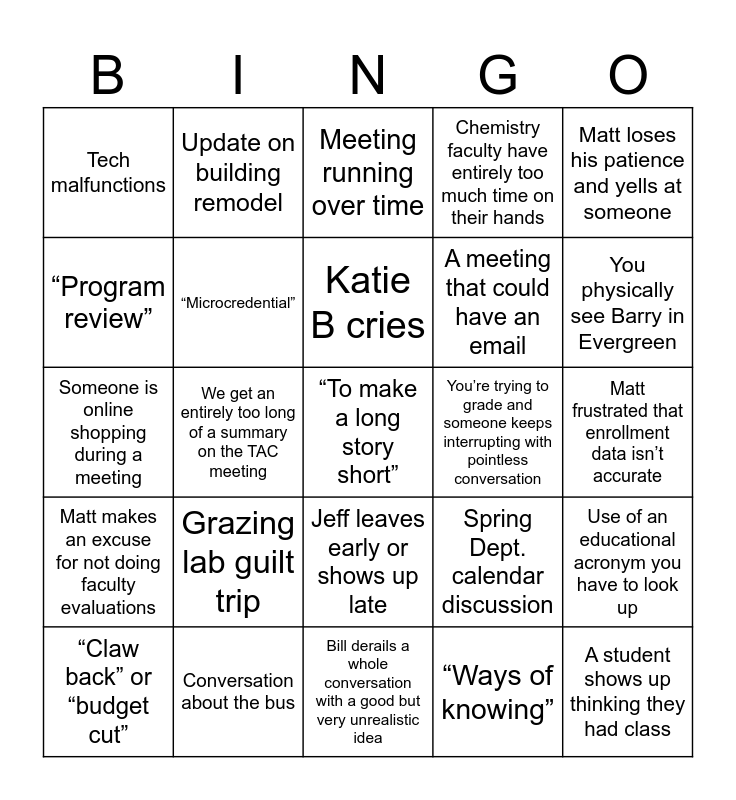 This bingo card has a free space and 24 words: Grazing lab guilt trip, Conversation about the bus, Katie B cries, “Claw back” or “budget cut”, Matt loses his patience and yells at someone, Tech malfunctions, “Program review”, Update on building remodel, You’re trying to grade and someone keeps interrupting with pointless conversation, Jeff leaves early or shows up late, A meeting that could have an email, Someone is online shopping during a meeting, Spring Dept. calendar discussion, Use of an educational acronym you have to look up, “Microcredential”, “Ways of knowing”, Matt frustrated that enrollment data isn’t accurate, Meeting running over time, You physically see Barry in Evergreen, We get an entirely too long of a summary on the TAC meeting, A student shows up thinking they had class, Matt makes an excuse for not doing faculty evaluations, Chemistry faculty have entirely too much time on their hands and Bill derails a whole conversation with a good but very unrealistic idea.