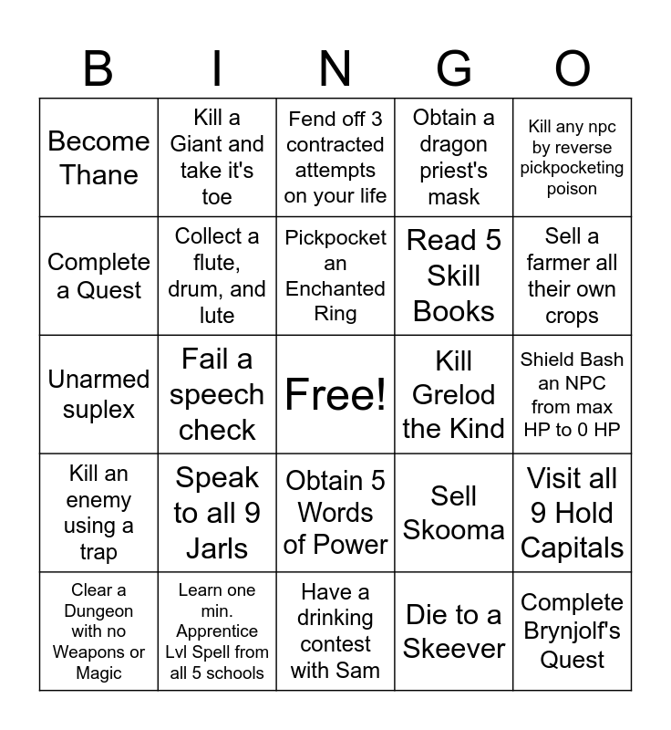 This bingo card has a free space and 78 words: Enchant a Necklace, Murder an NPC in their home & wreck the place, Fend off 3 contracted attempts on your life, Rent a room in 5 different inns, Slay a dragon, Cast a master level spell, Break out of Jail, Win a Brawl, Obtain a Follower, Feed as a Vampire, Reach Level 10, Meet M'aiq the Liar, Obtain a dragon priest's mask, Become Thane, Fill any Soul Gem, Complete a Quest, Kill a Reikling, Speak to all 9 Jarls, Meet both General Tullius & Ulfric Stormcloak, Shield Bash an NPC from max HP to 0 HP, Acquire any piece of a joinable guild's armor, Kill any npc by reverse pickpocketing poison, Unarmed suplex, Pickpocket an Enchanted Ring, Collect a flute, drum, and lute, Deliver 20 cases of alcohol to an inn, Kill a chaurus, Steal A Dibella Statue, Interrupt Rogvir's Execution & Escape, Kill a Hagraven, Sell a farmer all their own crops, Bankrupt a Merchant, Have a drinking contest with Sam, Meet a Ghost, Clear a Dungeon with no Weapons or Magic, Kill Grelod the Kind, Shoplift 200 gold value from 5 Separate Shops and get away with it, Eat 10 stolen sweet rolls, Make a Pile of 10 Cheese Wheels, Complete Brynjolf's Quest, Join a Guild, Obtain a Dragon Claw, Hold 10,000 Gold, Clear a Dungeon without healing, Obtain 3 Flawless Gems, Kill a Giant and take it's toe, Spend EXACTLY 1000 gold in one shopping trip, Enter a plane of oblivion, Pray to Every Divine (Including talos), Donate to all 11 Beggars, Visit all 9 Hold Capitals, Fail a speech check, Sell Skooma, Kill a child, Enter a Player Home, Loot a Unique Item, Catch 5 DIFFERENT fish, Kill one NPC from all playable races, Deliver Kharjo's moon amulet, Obtain 5 Words of Power, Read 5 Skill Books, Punch a Jarl, Contract all 9 contractible diseases, Kill a Guard with a Crossbow, Free a Prisoner from Capture, Obtain a full Guard uniform from 3 Holds, Kill a Frost Troll, Paralyze a Civilian, Kill an enemy using a trap, Learn one min. Apprentice Lvl Spell from all 5 schools, Kill a Daedra, "We're here to teach you a lesson", Perform a Kill with each of the 9 weapon types, Get Married, Die to a Skeever, Learn 5 new Spells, 10,000 Total Bounty and Killcam a Deer.