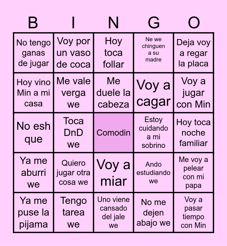 This bingo card has a free space and 24 words: Quiero jugar otra cosa we, Tengo tarea we, Me duele la cabeza, Ya me puse la pijama, Deja voy a regar la placa, No tengo ganas de jugar, Hoy vino Min a mi casa, Voy por un vaso de coca, Estoy cuidando a mi sobrino, Voy a miar, Voy a cagar, No esh que, Ando estudiando we, Me voy a pelear con mi papa, Me vale verga we, No me dejen abajo we, Hoy toca noche familiar, Hoy toca follar, Voy a jugar con Min, Toca DnD we, Voy a pasar tiempo con Min, Ya me aburri we, Ne we chinguen a su madre and Uno viene cansado del jale we.