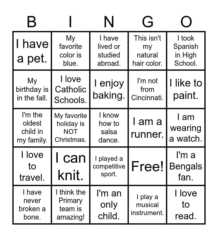 This bingo card has 25 words: I can knit., I'm an only child., I enjoy baking., I have never broken a bone., I took Spanish in High School., I have a pet., My birthday is in the fall., My favorite color is blue., I am a runner., I played a competitive sport., I'm not from Cincinnati., I'm the oldest child in my family., Free!, I'm a Bengals fan., I love Catholic Schools., I love to read., I am wearing a watch., I have lived or studied abroad., I like to paint., My favorite holiday is NOT Christmas., I know how to salsa dance., I think the Primary team is amazing!, I love to travel., This isn't my natural hair color. and I play a musical instrument..