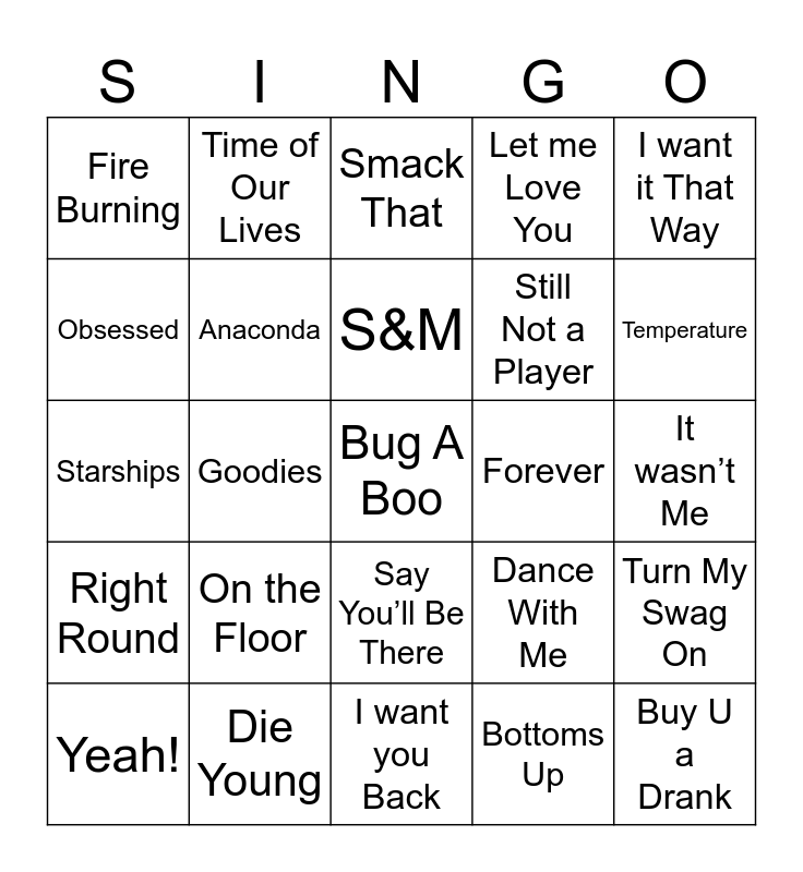 This bingo card has 75 words: Baby, Never Say Never, Smack That, Cyclone, Promiscuous, Hey Sexy Lady, Thong Song, Give it up to me, What’s Luv, Best Love song, Buy U a Drank, Hot in Herre, S&M, Obsessed, We belong Together, Goodies, Work It, Bug A Boo, Buttons, I want it That Way, Hypnotize, Starships, Anaconda, Time of Our Lives, Let me Love You, Sexy Can I, Hit ‘em up Style, Move Ya Body, Love, Get Busy, A Thousand Miles, Ride Wit Me, Last Night, Dance With Me, Temperature, Still Not a Player, Turn Me On, DJ Got Us Fallin’ in Love, It wasn’t Me, Bottoms Up, No Hands, Low, Get Low, Donk, Kiss Me Thru the Phone, Closer, Yeah!, Fire Burning, Replay, Hotel Room Service, Don’t Cha, Say You’ll Be There, Milshake, Genie in a Bottle, Hollaback, Wannabe, Baby One More Time, No Scrubs, Jumpin’ Jumpin’, Let’s Get Loud, On the Floor, Diva, Run the World, Don’t Stop the Music, All of the Lights, Forever, Gimme That, Down, Gold DIgger, Turn My Swag On, Right Round, Die Young, Poker Face, I want you Back and Summer Love.