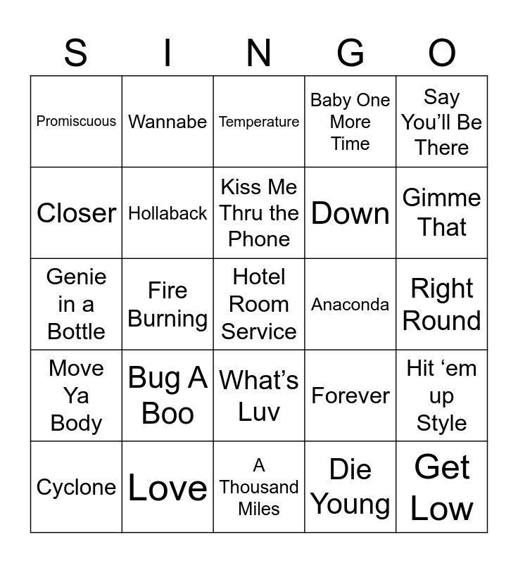 This bingo card has 75 words: Last Night, Dance With Me, Temperature, Still Not a Player, Turn Me On, DJ Got Us Fallin’ in Love, It wasn’t Me, Bottoms Up, No Hands, Low, Get Low, Donk, Kiss Me Thru the Phone, Closer, Yeah!, Fire Burning, Replay, Hotel Room Service, Don’t Cha, Say You’ll Be There, Milkshake, Genie in a Bottle, Hollaback, Wannabe, Baby One More Time, No Scrubs, Jumpin’ Jumpin’, Let’s Get Loud, On the Floor, Diva, Run the World, Don’t Stop the Music, All of the Lights, Forever, Gimme That, Down, Gold DIgger, Turn My Swag On, Right Round, Die Young, Poker Face, I want you Back, Summer Love, Baby, Never Say Never, Smack That, Cyclone, Promiscuous, Hey Sexy Lady, Thong Song, Give it up to me, What’s Luv, Best Love song, Buy U a Drank, Hot in Herre, S&M, Obsessed, We belong Together, Goodies, Work It, Bug A Boo, Buttons, I want it That Way, Hypnotize, Starships, Anaconda, Time of Our Lives, Let me Love You, Sexy Can I, Hit ‘em up Style, Move Ya Body, Love, Get Busy, A Thousand Miles and Ride Wit Me.