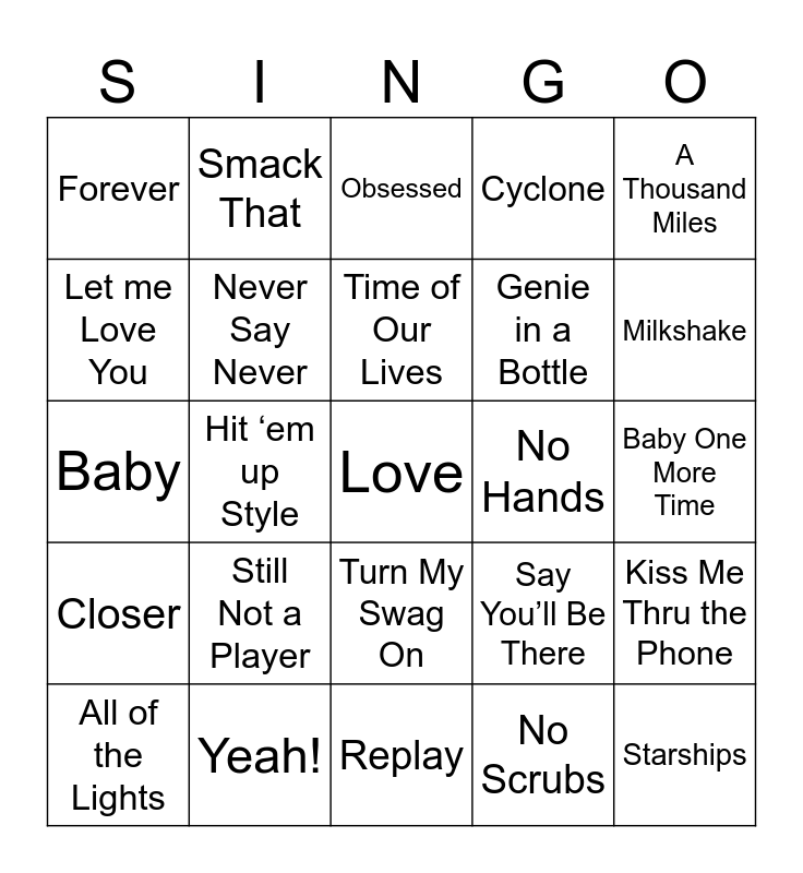 This bingo card has 75 words: Hot in Herre, S&M, Obsessed, We belong Together, Goodies, Work It, Bug A Boo, Buttons, I want it That Way, Hypnotize, Starships, Anaconda, Time of Our Lives, Let me Love You, Sexy Can I, Hit ‘em up Style, Move Ya Body, Love, Get Busy, A Thousand Miles, Ride Wit Me, Baby, Never Say Never, Smack That, Cyclone, Promiscuous, Hey Sexy Lady, Thong Song, Give it up to me, What’s Luv, Best Love song, Buy U a Drank, Don’t Cha, Say You’ll Be There, Milkshake, Genie in a Bottle, Hollaback, Wannabe, Baby One More Time, No Scrubs, Jumpin’ Jumpin’, Let’s Get Loud, On the Floor, Diva, Run the World, Don’t Stop the Music, All of the Lights, Forever, Gimme That, Down, Gold DIgger, Turn My Swag On, Right Round, Die Young, Poker Face, I want you Back, Summer Love, Last Night, Dance With Me, Temperature, Still Not a Player, Turn Me On, DJ Got Us Fallin’ in Love, It wasn’t Me, Bottoms Up, No Hands, Low, Get Low, Donk, Kiss Me Thru the Phone, Closer, Yeah!, Fire Burning, Replay and Hotel Room Service.
