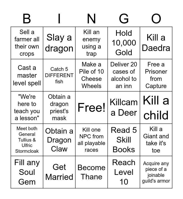 This bingo card has a free space and 78 words: Clear a Dungeon with no Weapons or Magic, Shield Bash an NPC from max HP to 0 HP, Kill an enemy using a trap, Punch a Jarl, Loot a Unique Item, Feed as a Vampire, Have a drinking contest with Sam, Kill Grelod the Kind, Eat 10 stolen sweet rolls, Join a Guild, Enchant a Necklace, Donate to all 11 Beggars, Hold 10,000 Gold, Sell a farmer all their own crops, Kill a chaurus, Cast a master level spell, Steal A Dibella Statue, Obtain a Dragon Claw, Break out of Jail, Kill a child, Complete Brynjolf's Quest, Kill a Daedra, "We're here to teach you a lesson", Make a Pile of 10 Cheese Wheels, Catch 5 DIFFERENT fish, Contract all 9 contractible diseases, Pickpocket an Enchanted Ring, Kill a Reikling, Enter a Player Home, Unarmed suplex, Free a Prisoner from Capture, 10,000 Total Bounty, Become Thane, Spend EXACTLY 1000 gold in one shopping trip, Fill any Soul Gem, Killcam a Deer, Interrupt Rogvir's Execution & Escape, Collect a flute, drum, and lute, Kill any npc by reverse pickpocketing poison, Acquire any piece of a joinable guild's armor, Deliver Kharjo's moon amulet, Learn one min. Apprentice Lvl Spell from all 5 schools, Obtain 3 Flawless Gems, Fail a speech check, Sell Skooma, Slay a dragon, Learn 5 new Spells, Enter a plane of oblivion, Visit all 9 Hold Capitals, Obtain a full Guard uniform from 3 Holds, Kill a Giant and take it's toe, Obtain a dragon priest's mask, Read 5 Skill Books, Shoplift 200 gold value from 5 Separate Shops and get away with it, Complete a Quest, Rent a room in 5 different inns, Clear a Dungeon without healing, Fend off 3 contracted attempts on your life, Kill a Guard with a Crossbow, Kill one NPC from all playable races, Deliver 20 cases of alcohol to an inn, Meet a Ghost, Obtain a Follower, Murder an NPC in their home & wreck the place, Kill a Hagraven, Obtain 5 Words of Power, Pray to Every Divine (Including talos), Paralyze a Civilian, Meet both General Tullius & Ulfric Stormcloak, Get Married, Perform a Kill with each of the 9 weapon types, Bankrupt a Merchant, Speak to all 9 Jarls, Kill a Frost Troll, Reach Level 10, Win a Brawl, Die to a Skeever and Meet M'aiq the Liar.