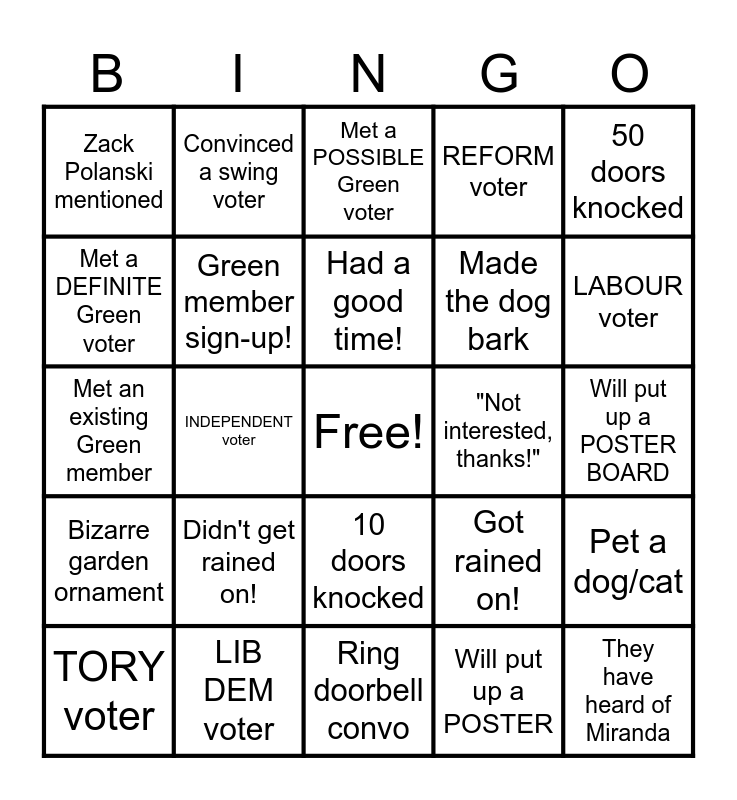 This bingo card has a free space and 27 words: Got rained on!, Badly positioned letterbox, Made the dog bark, Ring doorbell convo, Met a DEFINITE Green voter, Met a POSSIBLE Green voter, Convinced a swing voter, Bizarre garden ornament, "Not interested, thanks!", Pet a dog/cat, Met an existing Green member, REFORM voter, TORY voter, LIB DEM voter, LABOUR voter, Won't vote, Green member sign-up!, Had a good time!, Didn't get rained on!, Zack Polanski mentioned, Will put up a POSTER BOARD, Will put up a POSTER, INDEPENDENT voter, They have heard of Miranda, 10 doors knocked, 50 doors knocked and First door knocked.